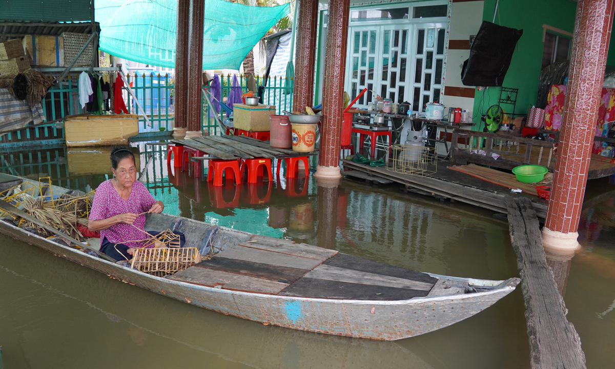 Lũ cao khiến việc đến trường của học sinh gặp khó. Chiều 22/10, anh Lê Lâm Thiện, 35 tuổi, ở ấp Vĩnh Bửu, xã Vĩnh Châu, phải dùng vỏ lãi đón con và ba cháu tan học. Nhà cách trường chỉ 2 km, song năm nay lũ lớn, chính quyền cho xáng đắp cao tuyến đê – tuyến đường bộ duy nhất – để bảo vệ lúa, khiến người dân phải di chuyển bằng xuồng.