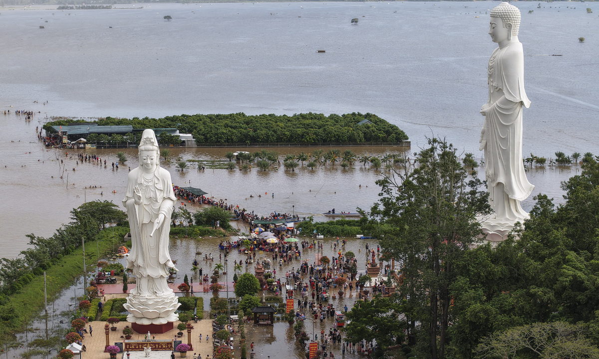 Khoảng một tháng nay, khu vực quanh Phù Sơn Tự (còn gọi là chùa Núi Nổi) mênh mông nước. Ngôi chùa nằm giữa đồng lúa trũng, mùa lũ (khoảng tháng 9-10 âm lịch) ngập trắng nước, thu hút nhiều khách thập phương tới tham quan.