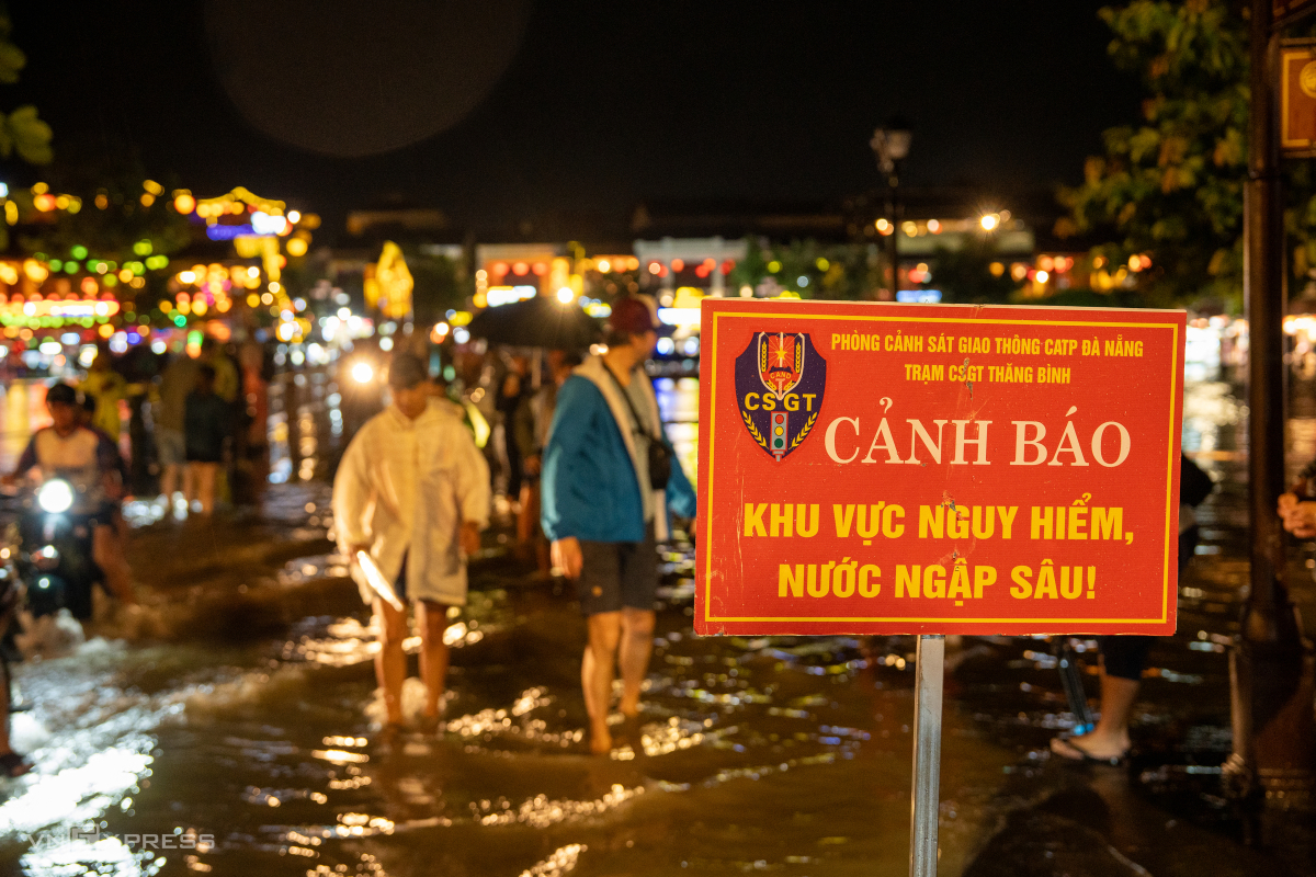 Phố cổ Hội An lúc 21h, nước lũ sông Hoài tiếp tục dâng cao.
