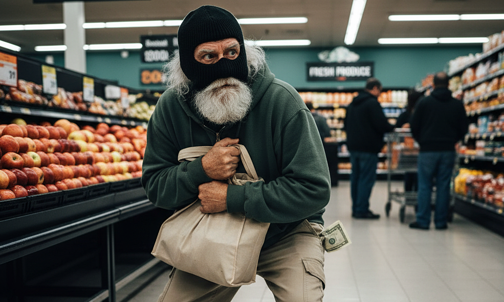 Sau khi mua một miếng phô mai và chai rượu vang, ông đến quầy thanh toán yêu cầu nhân viên thu ngân đưa tiền cho mình. Ông sau đó kiên nhẫn đợi nhân viên này gọi cảnh sát đến.